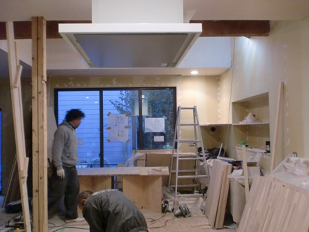 キッチンは製作です。大工工事でベース部分を作り、天板は人工大理石の組み合わせ。写真は、部材の加工中。ちなみに写真上部に写っているのは、白色のアイランドフード。