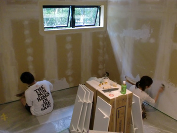 DIYの場合、材料が出来上がった状態の漆喰を使うことがほとんどです。が、今回は現場から材料を分けてもらったので材料作りから。ご主人に練りを任せて、私と奥様は部屋の養生テープ張りでスタートです。