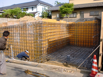 基礎の配筋チェック。ホールダウンアンカー、鉄筋の納まり、設備のスリーブとかを確認。幾つか手直しをお願いして、OK。